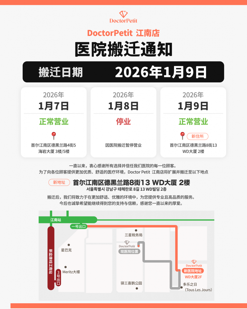 位于从首尔站和明洞站易来的江南站,从1号出口出来走2分钟左右就可以到院了!